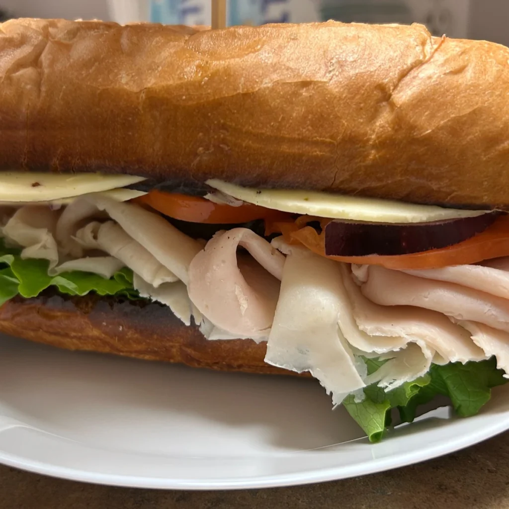 Freshly sliced turkey piled on a toasted sub with lettuce, tomato, mayo, and red onion. Add cheese, pickles, and extra toppings.