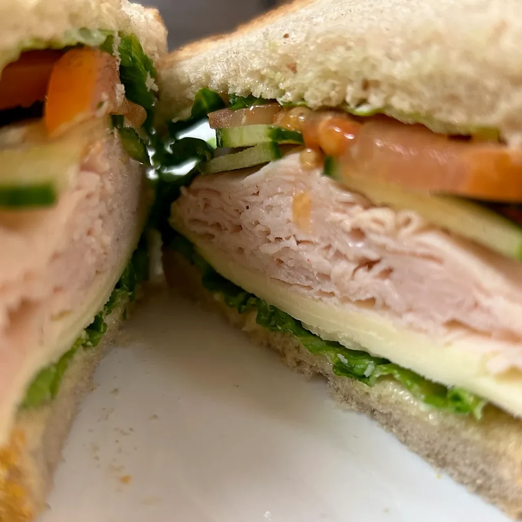 Sliced roasted turkey with crisp lettuce, tomato, onion, mayo and add extras like cucumber or bell peppers, on soft roll or bread.