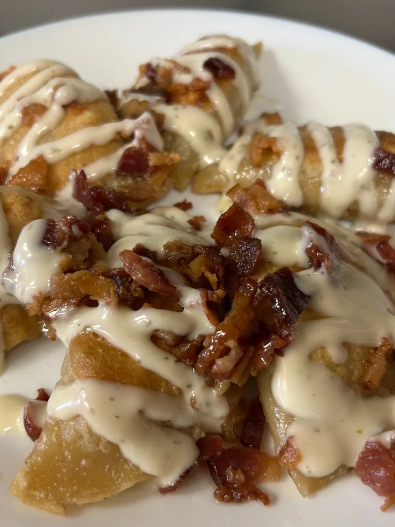 A modern Slavic-American pierogi twist: chicken‑and-bacon filling finished with a drizzle of homemade creamy ranch sauce. Perfect for that authentic comfort food craving.