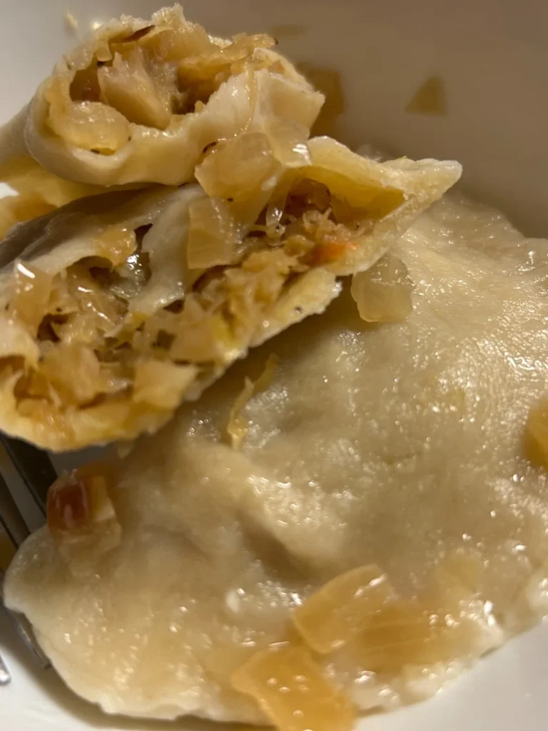 Sautéed cabbage and mushroom filling wrapped in homemade pierogi dough—rich, earthy, and inspired by old-world family recipes from Poland.
